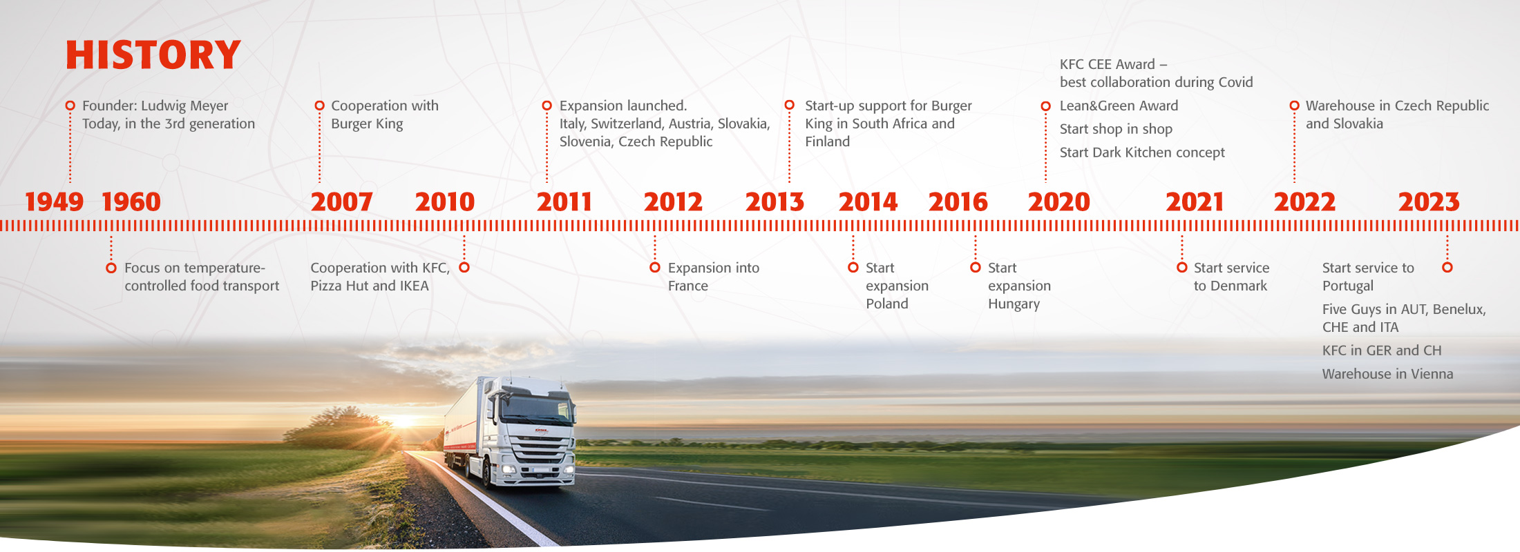 We continue to build on a solid foundation that was first laid in 1949 when Ludwig Meyer founded our sister company as a regional transport firm with only one truck. High demand ensured rapid growth and the subject of refrigerated transport was soon to become the next milestone for the company. In 1960 a long-distance truck fleet for international refrigerated and deep-freeze transport was established. It was also the year that Meyer Quick Service Logistics was founded. Since then, our success has been characterized by service excellence, and flexibility, high quality standards as well as a comprehensive and well-thought-out supply chain solution that provides absolute reliability. In summary QSL offers you the peace of mind you need to concentrate on your core business, while we bring added value to your business by taking care of your logistics.
